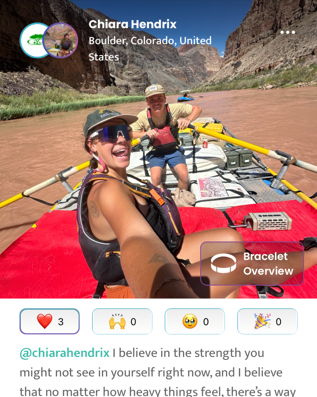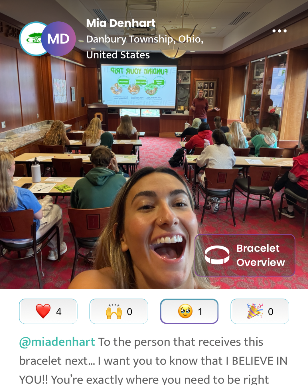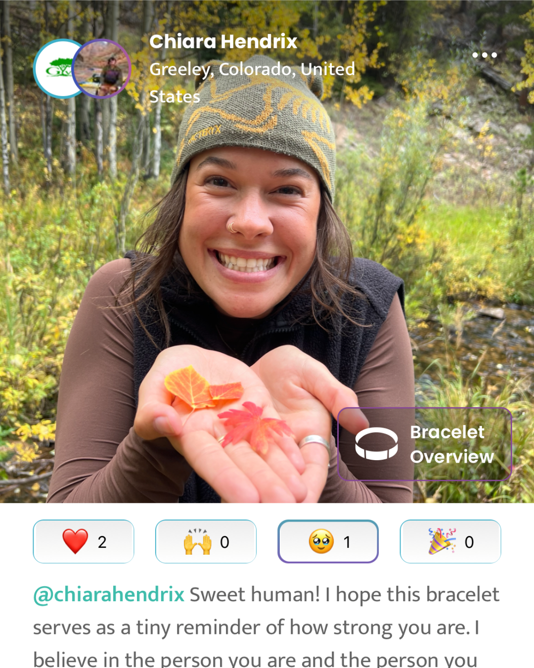 Track the bracelet’s journey in real time as it moves from person to person, creating a ripple effect of positivity.