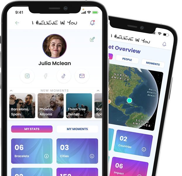 I Believe In You is a movement that was created to encourage & facilitate small acts of kindness on a global scale through our bracelets & mobile app. The world needs kindness, love and unity now more than ever, and we're here to lead that charge from the front. Our bracelets are meant to be worn until you're inspired to give them away to someone to let them know you believe in them. Our mobile app allows you to connect your bracelet, upload content to the bracelet (like instagram), and then follow the journey of your bracelet around the world inside the mobile app once you've given it away.