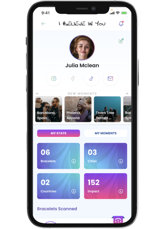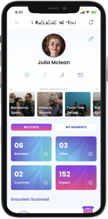 Our mobile app captures the unique journey of each bracelet as it travels from person to person around the world.
