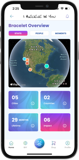 Track the bracelet’s journey in real time as it moves from person to person, creating a ripple effect of positivity.